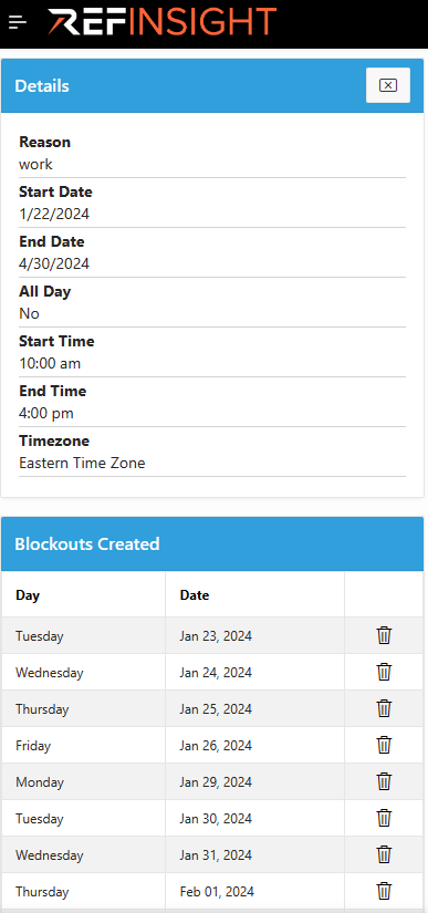 When the official saves this configuration, it will create all of the necessary Blockouts during that range of time. Using this tool, they can create Blockouts going out as far as 1 year.