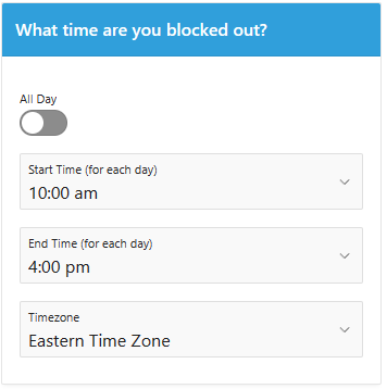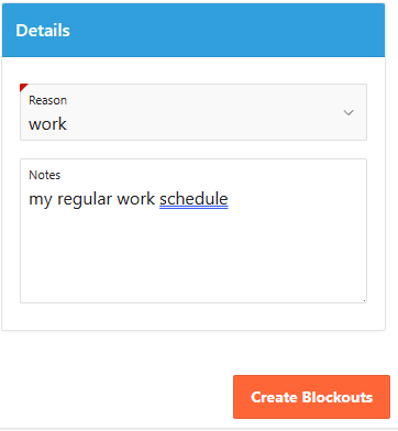 Officials often need to put in there Blockouts in a repeating manner. For example, they may need to put in a work schedule that is Monday through Friday. Or perhaps, they are unavailable Monday, Thursday, and Friday for college classes.